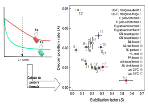 A partir de la pérdida de peso de ambos tés se obtienen dos parámetros. Por un lado, la estabilización (S), asociada al grado en que parte del material orgánico queda más estabilizado. Por otro, k, relacionado con la velocidad inicial de descomposición de la fracción más lábil del material vegetal. Ambos parámetros permiten interpretar, de forma comparativa, la dinámica de descomposición de la materia orgánica en el suelo.